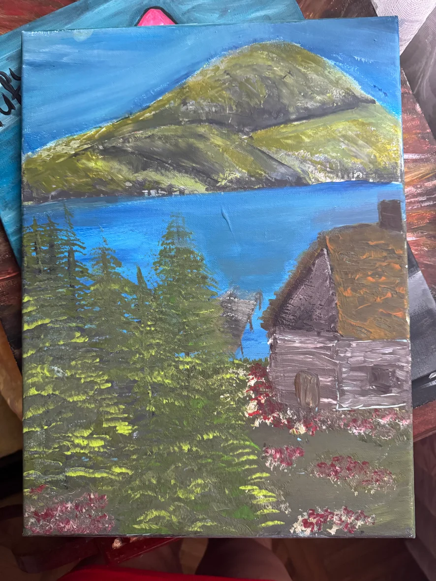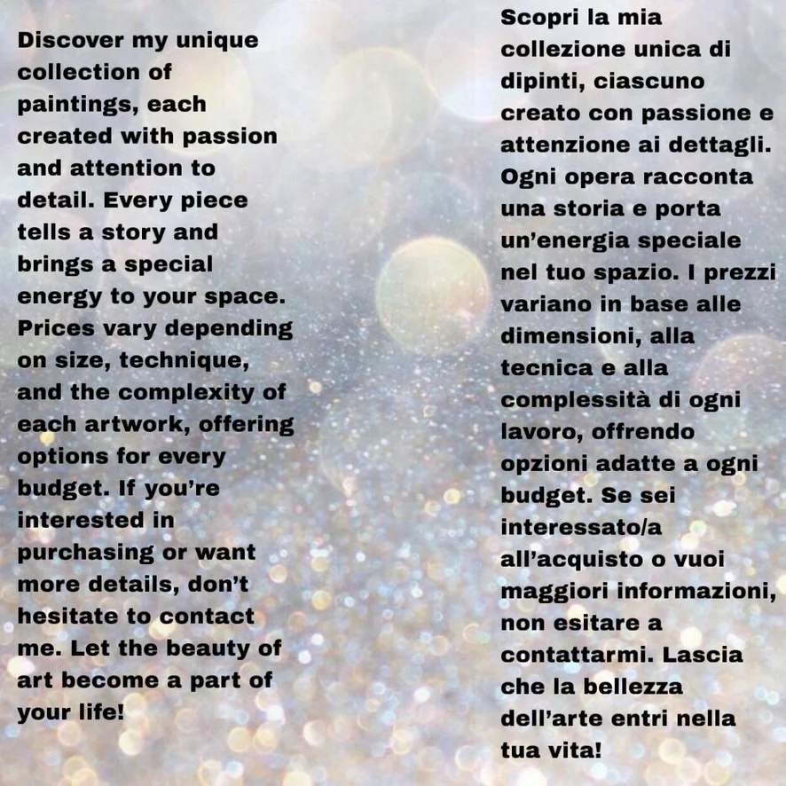 Titolo: „La Baita sul Lago” Dimensioni: [es. 30x40 cm] Tecnica: Acrilico su tela, texture spessa (con spatola) Dipinto fatto a mano che evoca la tranquillità di una baita di legno nel cuore della foresta. I colori scuri della montagna e della foresta sono bilanciati dai riflessi sull’acqua e dai fiori rossi del giardino. ✔️ Dipinto originale ✔️ Texture spessa – molto espressivo ✔️ Ideale per arredamento rustico o spazi intimi (baite, case vacanza) Title: “The Cabin by the Lake” Size: [e.g. 30x40 cm] Technique: Acrylic on canvas, thick texture (palette knife) Hand-painted artwork that captures the peace of a wooden cabin in the heart of the forest. The dark tones of the mountains and woods are balanced by the reflections in the water and the red flowers in the garden. ✔️ Original painting ✔️ Thick texture – highly expressive ✔️ Ideal for rustic decor or cozy spaces (cabins, vacation homes) PRICE 450€