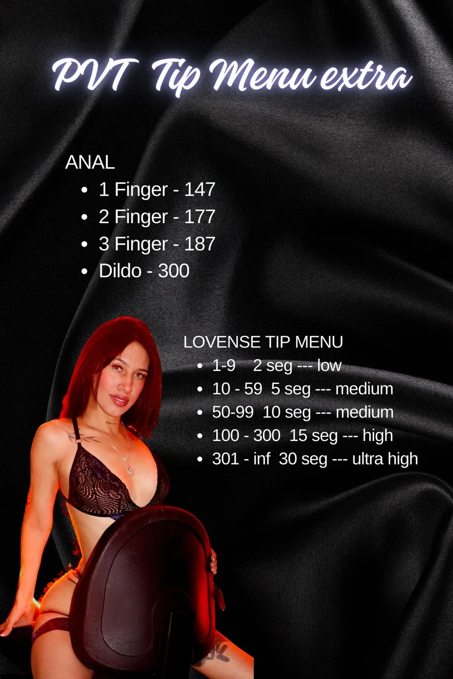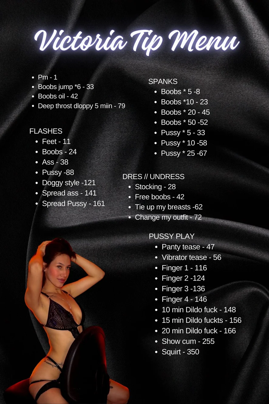 도기 스타일, 오일 쇼, 에로틱 댄스, 스트립쇼, 섹스 기구, 스모킹, 하이힐, 트월킹, 음란한 대화, 재갈, 딥스로트, 블로우잡, 젖치기, 하드코어, 카멜토우, 페이셜, 컴샷, 크림파이, 핑거링, 딜도 또는 바이브레이터, 자위, 핸드잡, 젖소